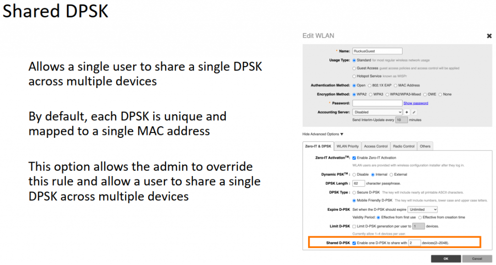 Jagatud DPSK (Dynamic Pre-Shared Key) - valikuliselt võib teil olla üks võti paljude seadmete jaoks. See võib olla kasulik, kui mõnel nutitelefonil on muutuv MAC-aadress.