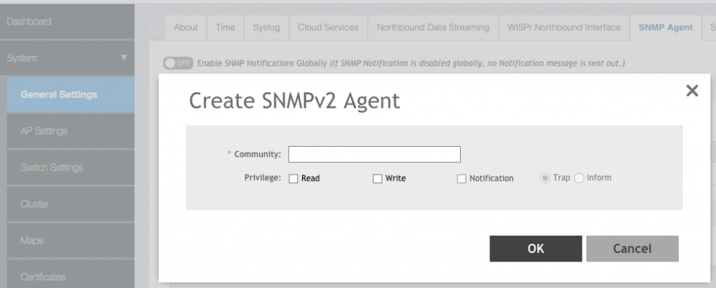 Kõigepealt tuleb SmartZone-s käivitada snmp agent ja määrata community (parool).