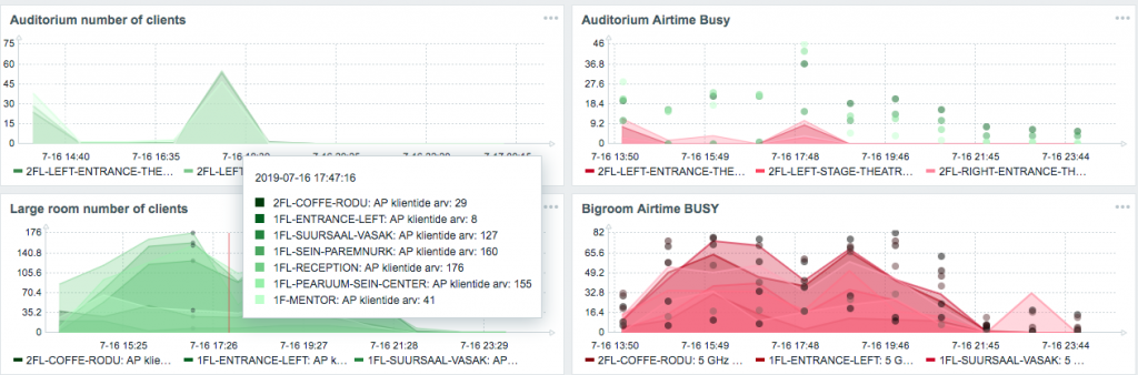 Järgnev on näide Zabbixi ja smartzone SNMP jälgmisest, kus infot kogutakse klientide arvu kohta igas AP-s ja õhu hõivatuse kohta 2.4 ja 5GHz sagedustel.
